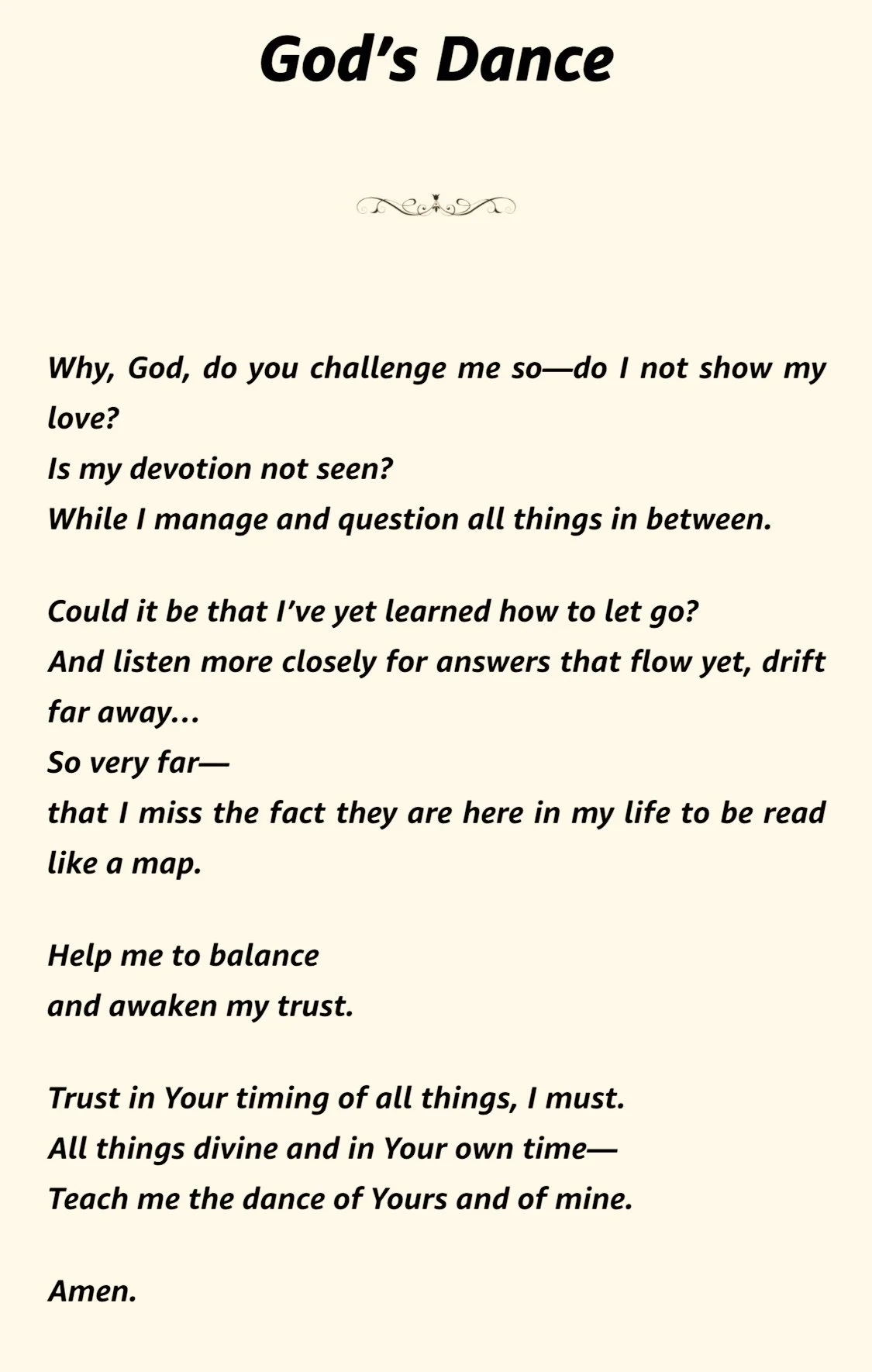 God’s Dance- a poem Mar 19 Written By Rene Terry Mucci —- from I’ll Sing Again Tomorrow For the days you question everything. Rene Terry Mucci
