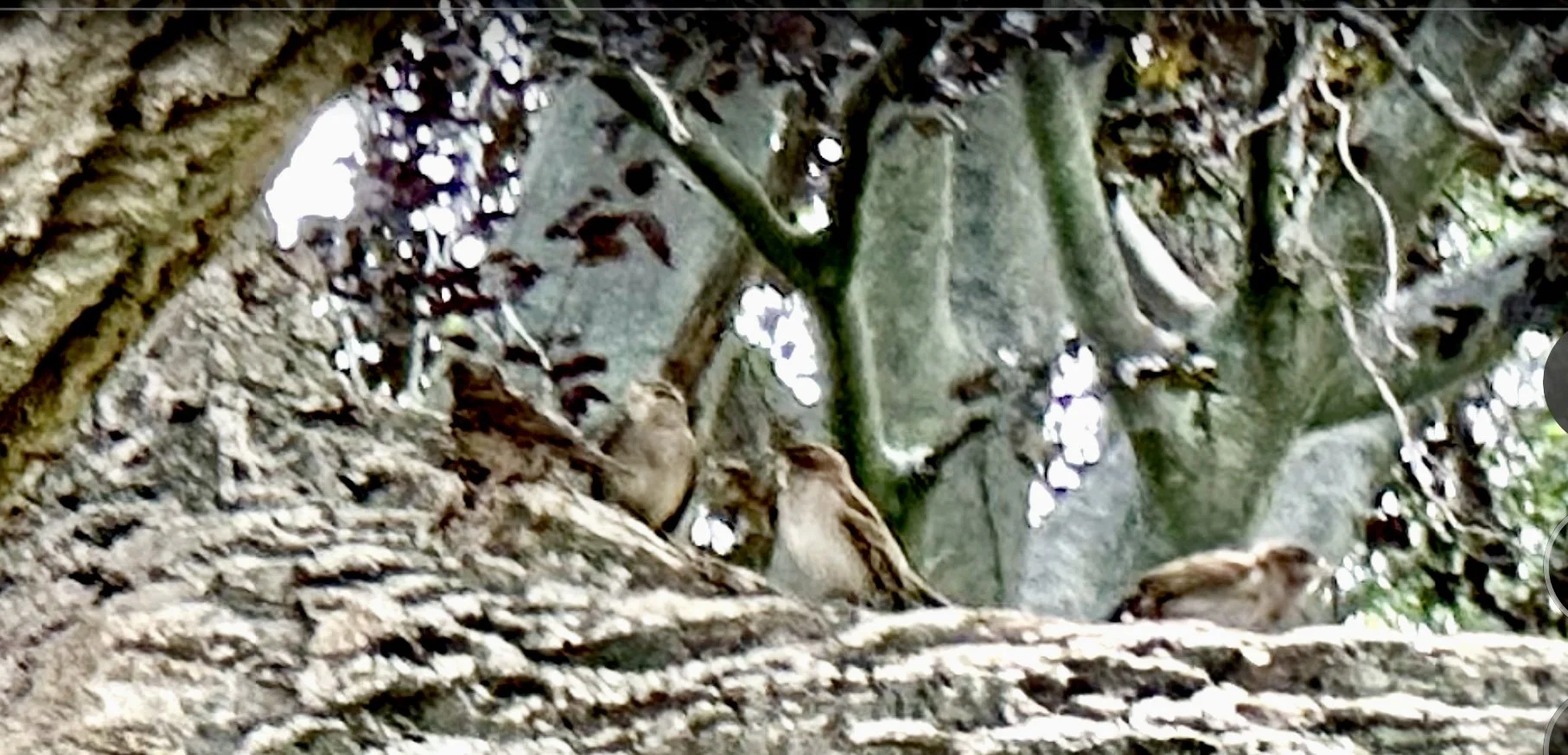 With further view, a soft landing for mama sparrow and 3 babies fluttering to be fed.