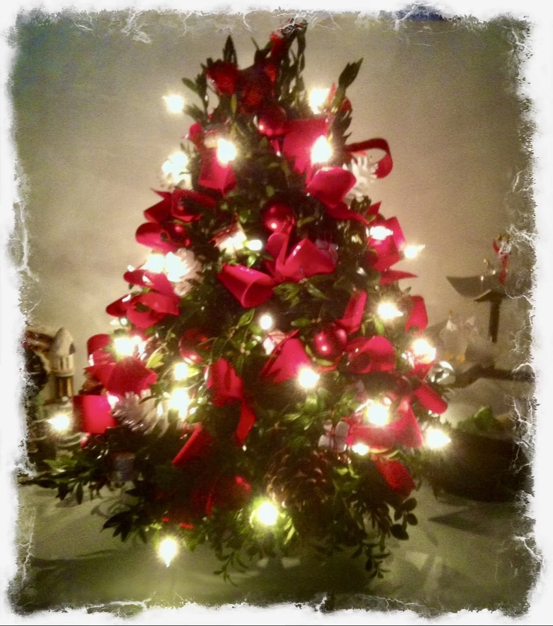 Our anniversary was within 9 days of Christmas so for our 25th wedding anniversary, John had this beautiful boxwood tree arrangement made to celebrate. Adorned with white lights, Red and white, ornaments and red bows, It was breathtaking.