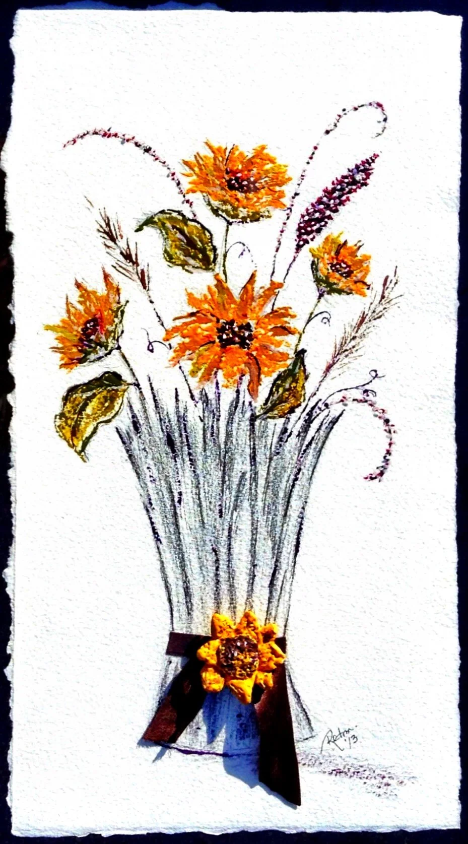 Above is a combined mixture of watercolor, both light and opaque, pencil with marker, ribbon, and clay. The concept was to have a black and white vase while the flowers pop with color.