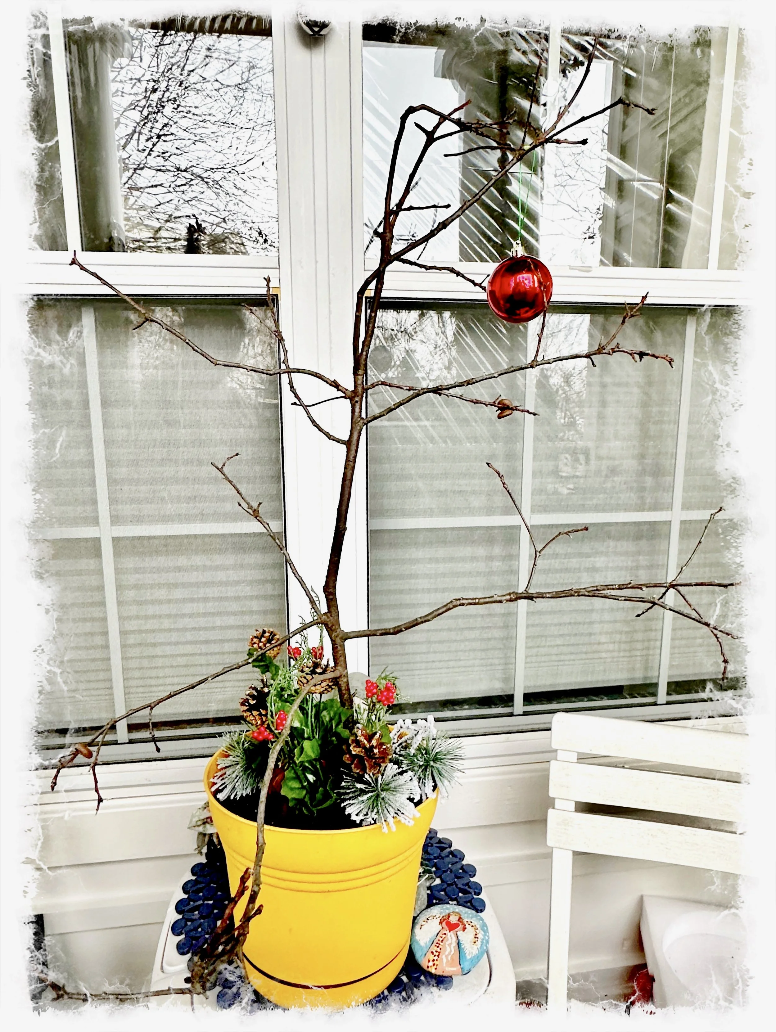 While walking Walter one day, this branch with acorn tops still attached was lying on the ground. No doubt, it would be discarded during the next lawn clean-up. Just then, I saw in it the making of a Charlie Brown tree. For all the trees that John and I have collected over the years, we never had a Charlie Brown tree.