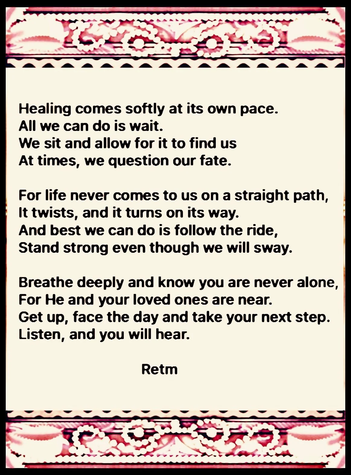 One of my Recovery Through Poetry poems I wrote after losing my husband, John. I found it healing. I hope you do, also.
