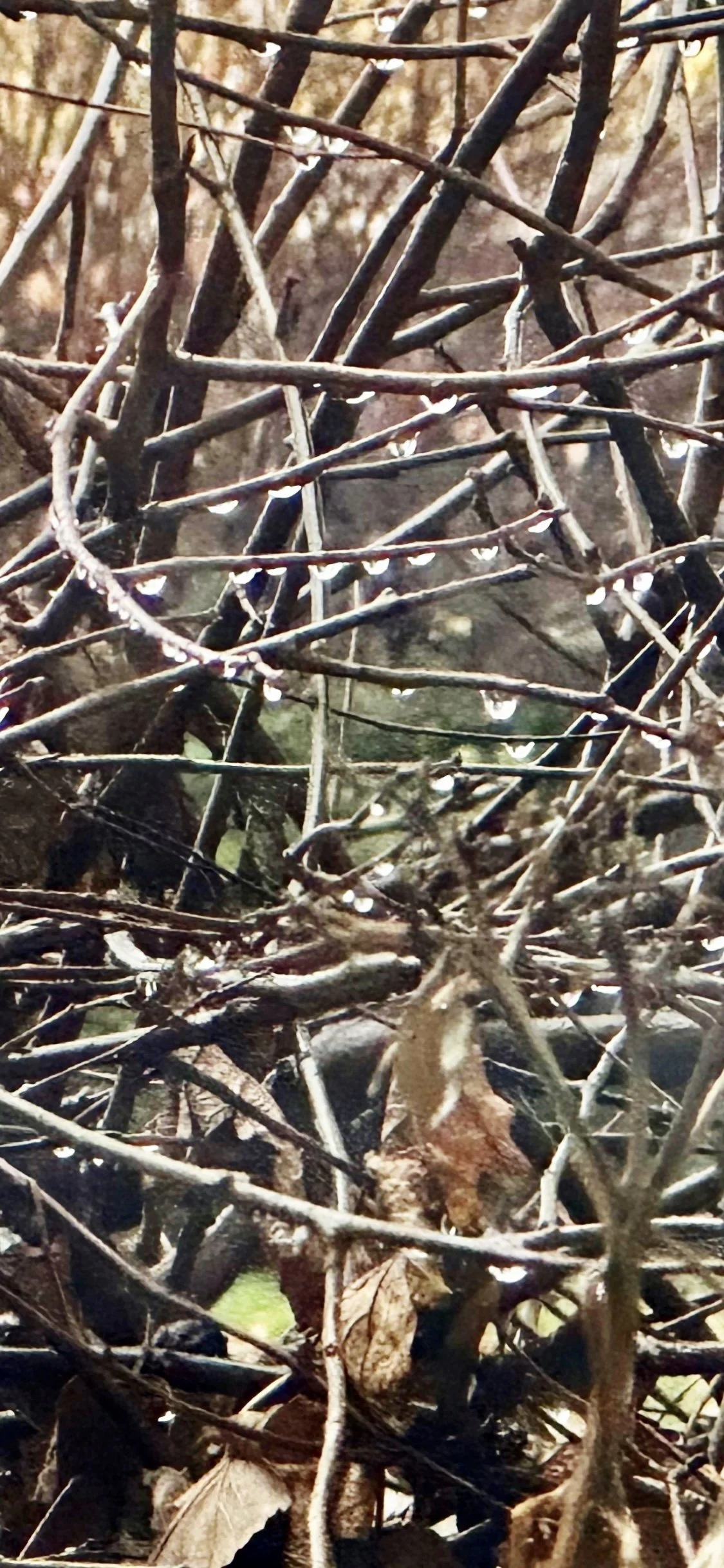 You can easily overlook a barren bush of no flowers or leaves. Yet, on a wet morning like this day, the raindrops hang on and glisten in the wind.