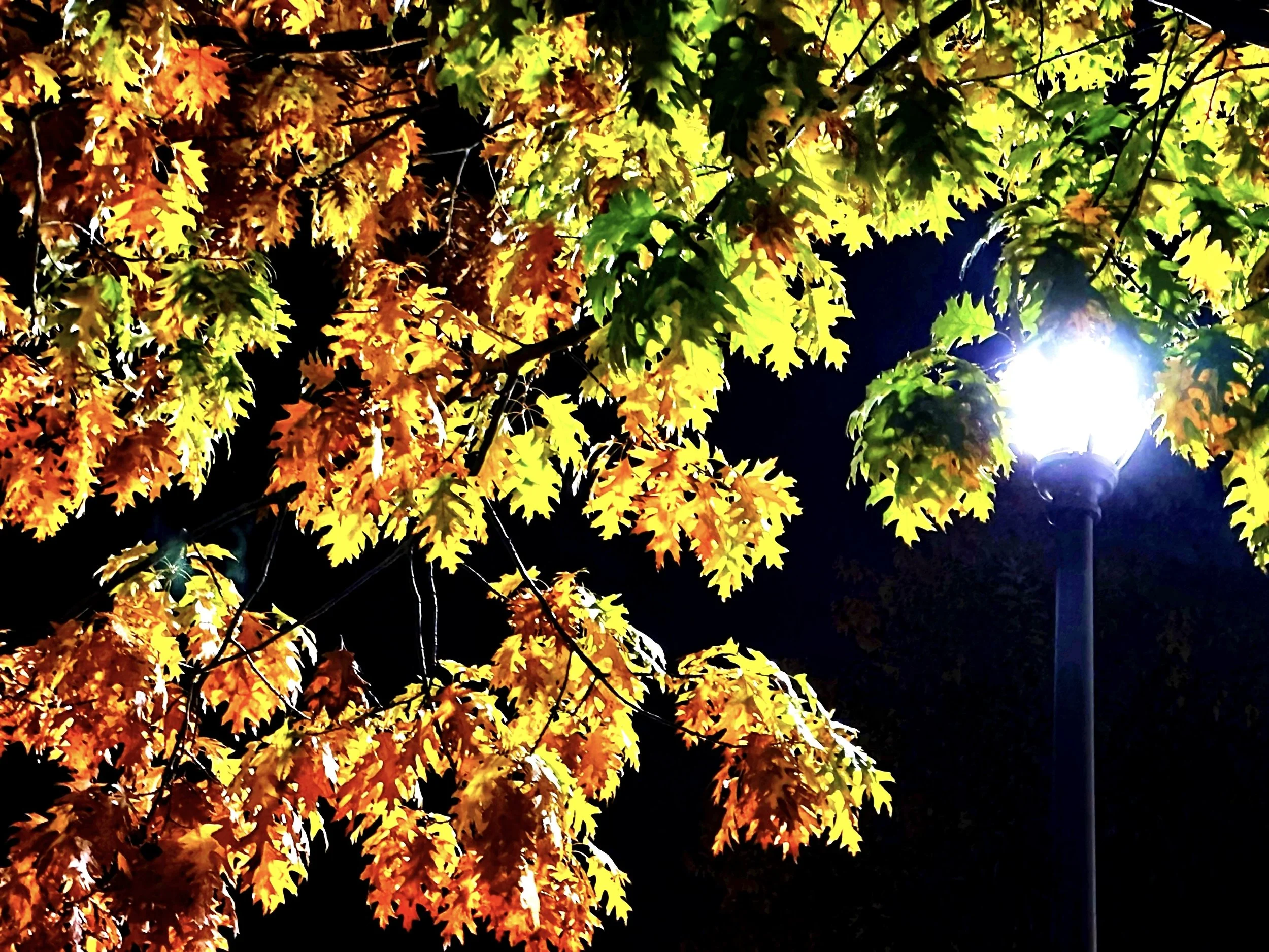 Dark night before Halloween. Bursts of color dancing in the breeze against a black sky. The only light is the lamppost.